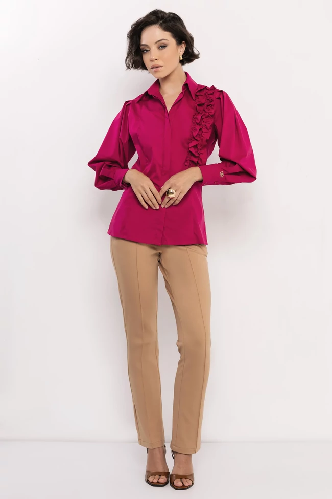 Fehér és fuxia árnyalatban elérhető, így egyszerre kínál letisztult alapot és élénk, karakteres választást. A szabásvonal a klasszikus női blúzok hagyományait idézi, de modern csavarral, amely bármilyen outfitet feldob. Szoknyával kombinálva elegáns, nadrággal pedig modern és üzleties hatást kelt.