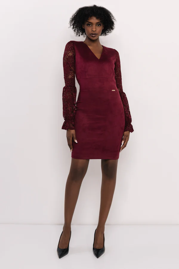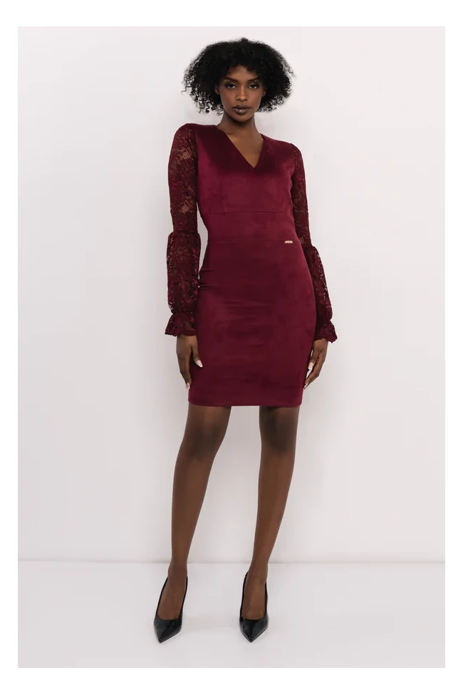 A fazon karcsúsított, térd fölé érő szabással formálja az alakot, a V-kivágás pedig szépen nyújtja a felsőtestet. A hosszú, csipkés ujjak, a végükön bájos fodorral, elegáns, romantikus karaktert adnak a ruhának. A puha velúr gyönyörűen simul, miközben komfortos viseletet ad. Bordó és fekete színben is elérhető.