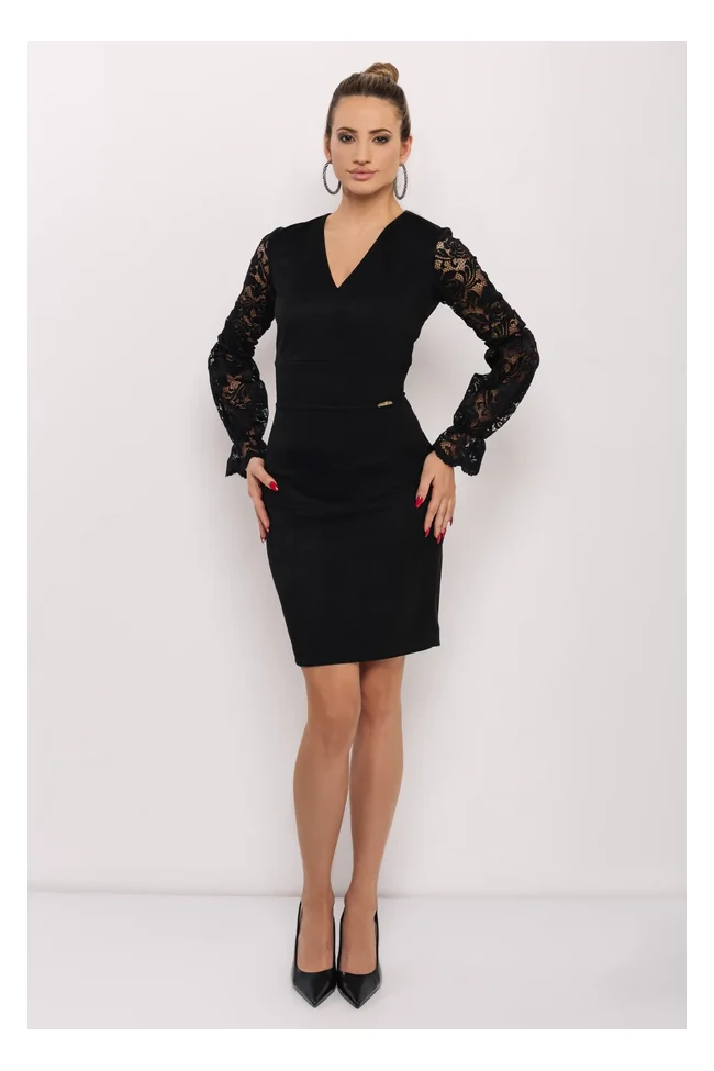 A fazon karcsúsított, térd fölé érő szabással formálja az alakot, a V-kivágás pedig szépen nyújtja a felsőtestet. A hosszú, csipkés ujjak, a végükön bájos fodorral, elegáns, romantikus karaktert adnak a ruhának. A puha velúr gyönyörűen simul, miközben komfortos viseletet ad. Bordó és fekete színben is elérhető.