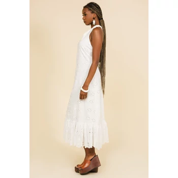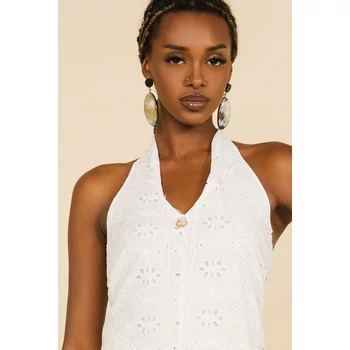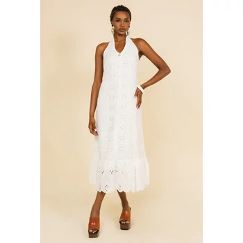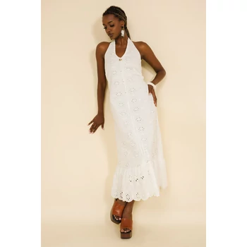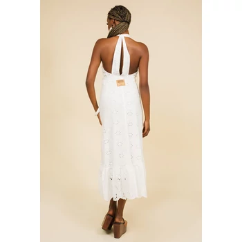 Az AMNESIA Maxara ruha légiesen könnyű madeira anyagból készült, finom brodériés mintázattal, amely hűsítő kényelmet biztosít a meleg napokon. A V-kivágás elegánsan emeli ki a dekoltázst, míg a deréktól lazán bővülő, maxi hosszúságú szoknyarész fodros alsószegéllyel zárul, ami minden lépésnél szabad mozgást enged. Viseld papuccsal nyári sétákhoz vagy magassarkúval egy különleges vacsorához – garantáltan a figyelem középpontjába kerülsz! A modell magassága: 178 cm. Az öv nem a ruha tartozéka! |