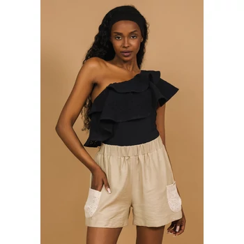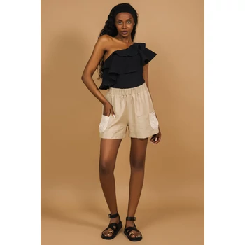 A madeiracsipkés zseb és a lezser fazon teszi az AMNESIA Kendy shortot különleges nyári alapdarabbá. Len és madeira anyagból készült, bézs és fekete színben is elérhető – viseld egyszínű toppal vagy fodros felsővel, és szerezd be most az amnesia.hu webshopon, amíg elérhető! A modell magassága: 175 cm. |