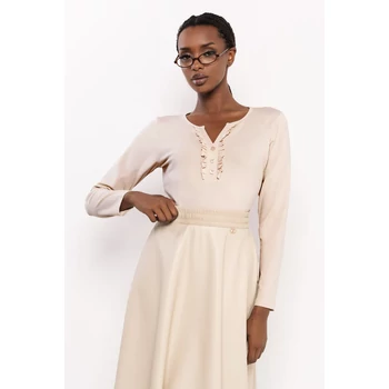Az AMNESIA Gemi felső letisztult, nőies alapdarab, amely bármely ruhatárba könnyedén beilleszthető. Pamut anyaga kellemes tapintású és komfortos viseletet nyújt, így egész nap ideális választás. Az egyméretes fazon kényelmesen követi a test vonalát, a V-kivágás mentén futó fodros díszítés pedig finom, elegáns részletet kölcsönöz a darabnak. A felső ekrü, vaj és fekete színben érhető el, így többféle stílusban is hordható. A klasszikus szabás és a visszafogott díszítés miatt könnyen kombinálható elegáns nadrággal vagy szoknyával, de sportosabb összeállításban, farmerrel és sneakerekkel is remekül mutat. Ez az a darab, amely egyszerre hozza el az elegancia és a lezser stílus előnyeit. Párosítsd az AMNESIA Gemi felsőt az aktuális őszi kollekció nadrágjaival, ahogy a fotón is látható, és alakíts ki saját stílusodhoz illő szettet. Ha sokoldalú, időtálló alapdarabot keresel, a Gemi felső az amnesia.hu webshopon a legjobb választás számodra! |