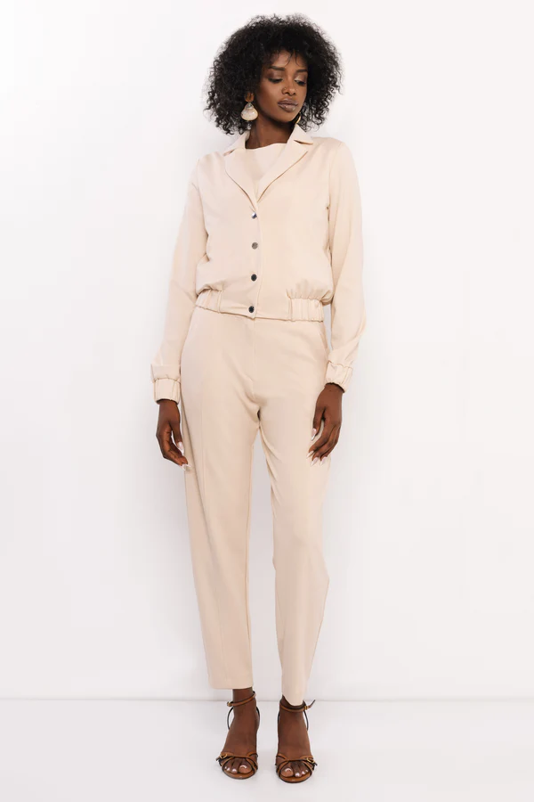 Punto anyagunk közepesen testes, rugalmas és tartós textil, amely szépen keretezi az alakot, miközben kényelmes viseletet biztosít. Puha tapintása és elegáns esése miatt tökéletes választás nadrágokhoz, ruhákhoz és dzsekikhez az őszi-téli szezonban.