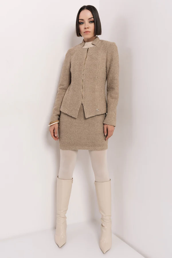 A blézer letisztult fazonnal, kerekített nyakkivágással és enyhén karcsúsított vonalakkal készült, amelyek szépen formálják a felsőtestet. Lurex szövetből készül csoki és drapp színben, S és M méretben érhető el, a hozzá illő AMNESIA Frutta ruhával vagy szoknyával pedig harmonikus, elegáns összeállítást ad.