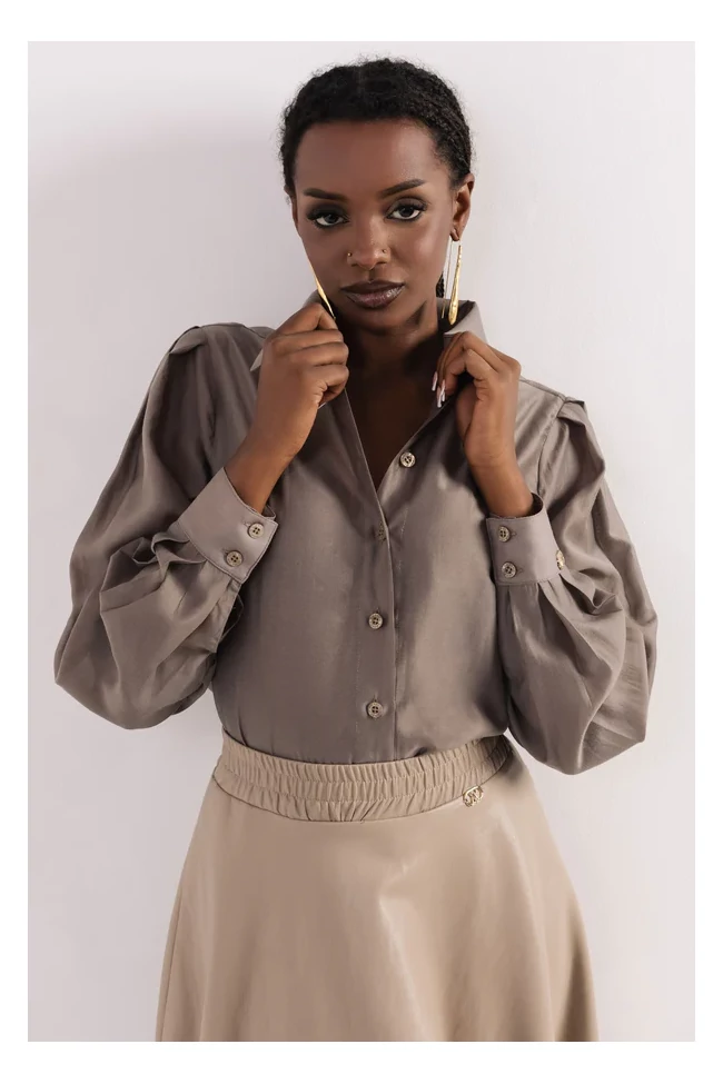 Puha voile anyagból készült, amely finom esésével és enyhe fényével luxus érzetet kölcsönöz viselőjének. A karcsúsított szabásvonal kiemeli a nőies sziluettet, a mandzsettákon található apró gombdíszítés pedig visszafogott eleganciát sugároz. A kényelmes viseletet a természetes anyag biztosítja, amely kellemes tapintású és jól szellőzik.