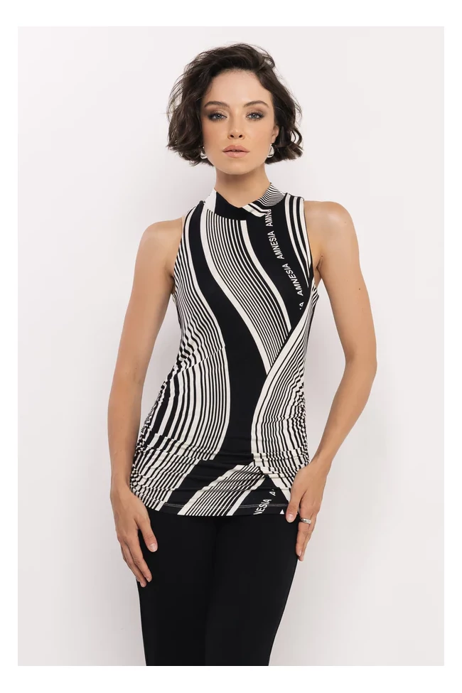Az AMNESIA Szetta top igazi statement darab: erőteljes, modern megjelenésével azonnal magára vonja a tekintetet. A fekete-fehér kontraszt és a különleges vonalvezetés elegáns dinamizmust sugall, amely tökéletes választás a magabiztos nők számára.